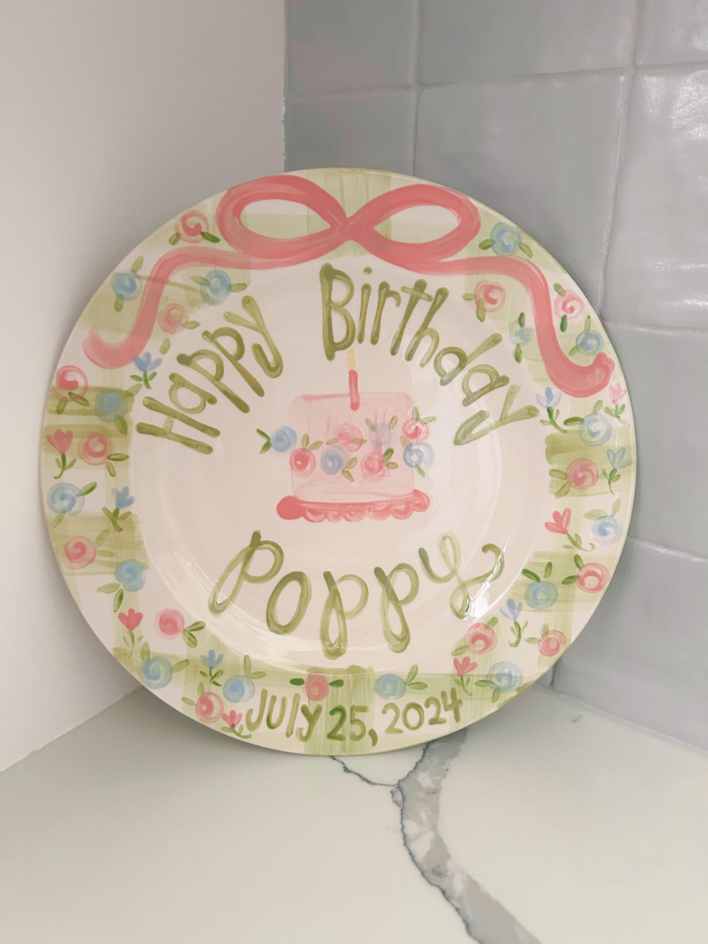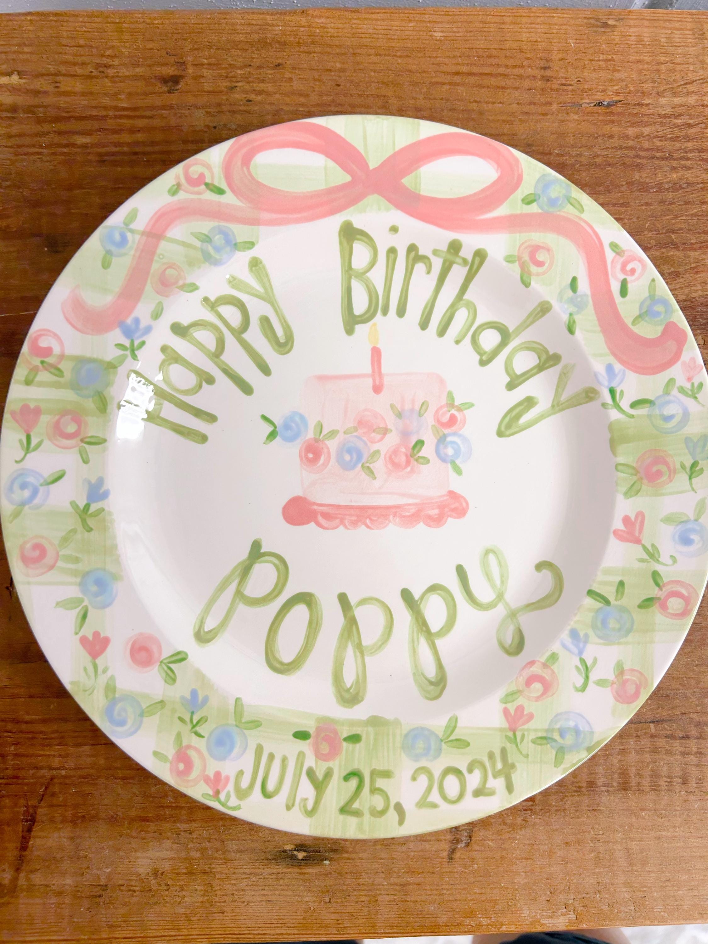 Hand painted wildflowers with sweet green lettering and a green gingham border adorn this sweet plate, making a precious birthday tradition.