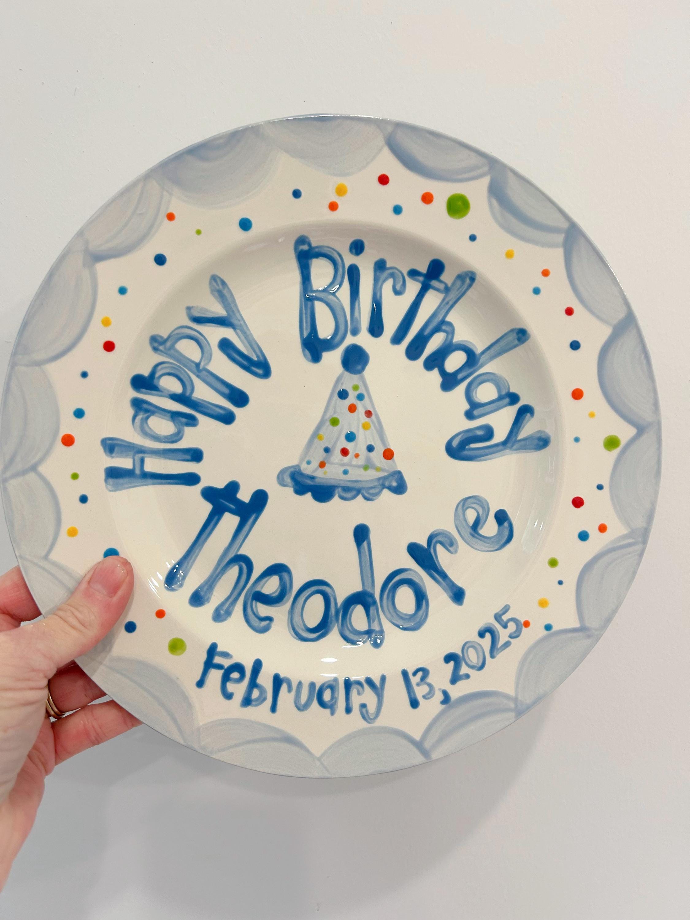 A custom party hat plate makes the perfect First Birthday gift! Personalized with your little one’s name (and birthdate if desired)