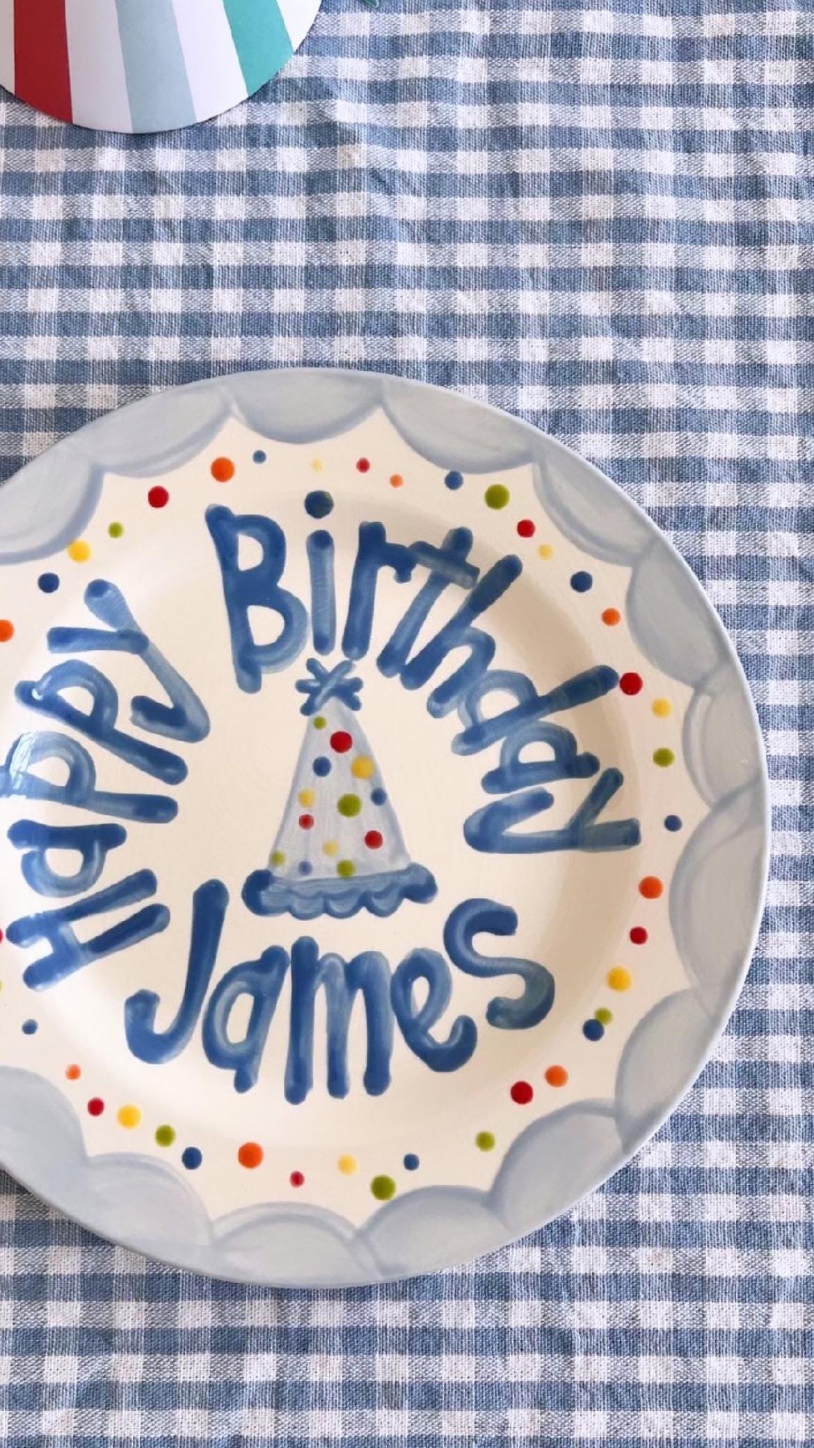 Personalized Boys Birthday Plate: Hand-Painted Ceramic Party Hat colorful dots
