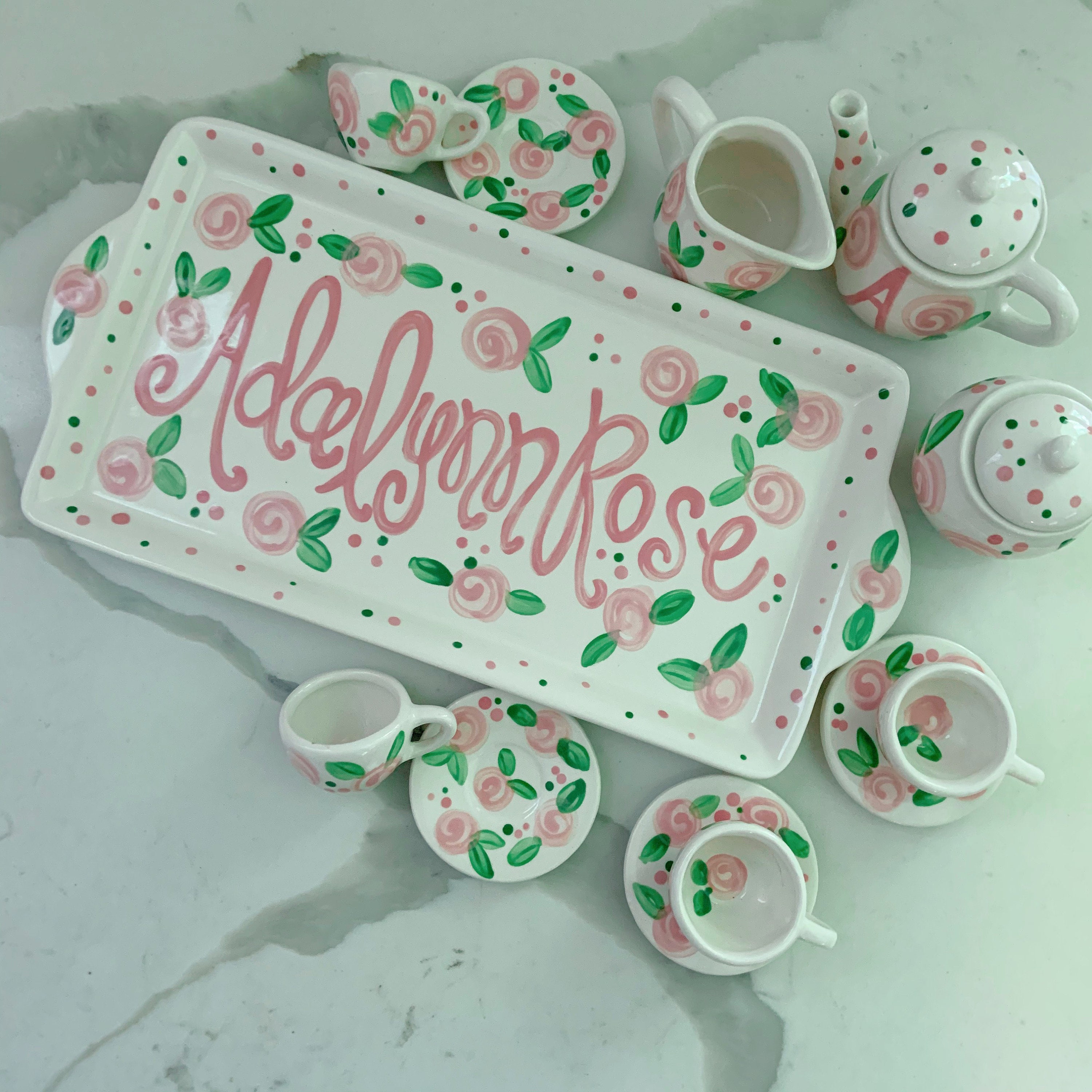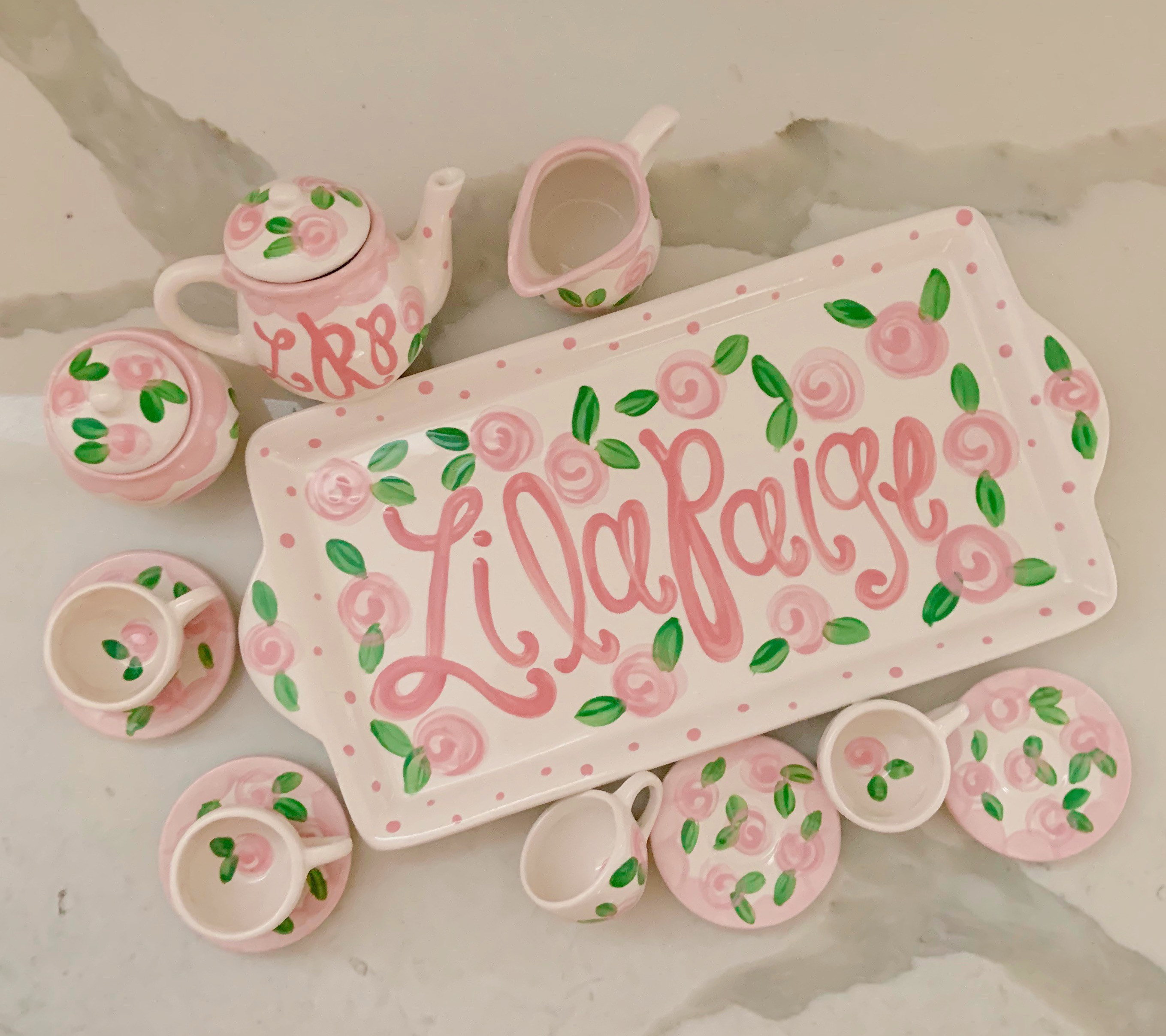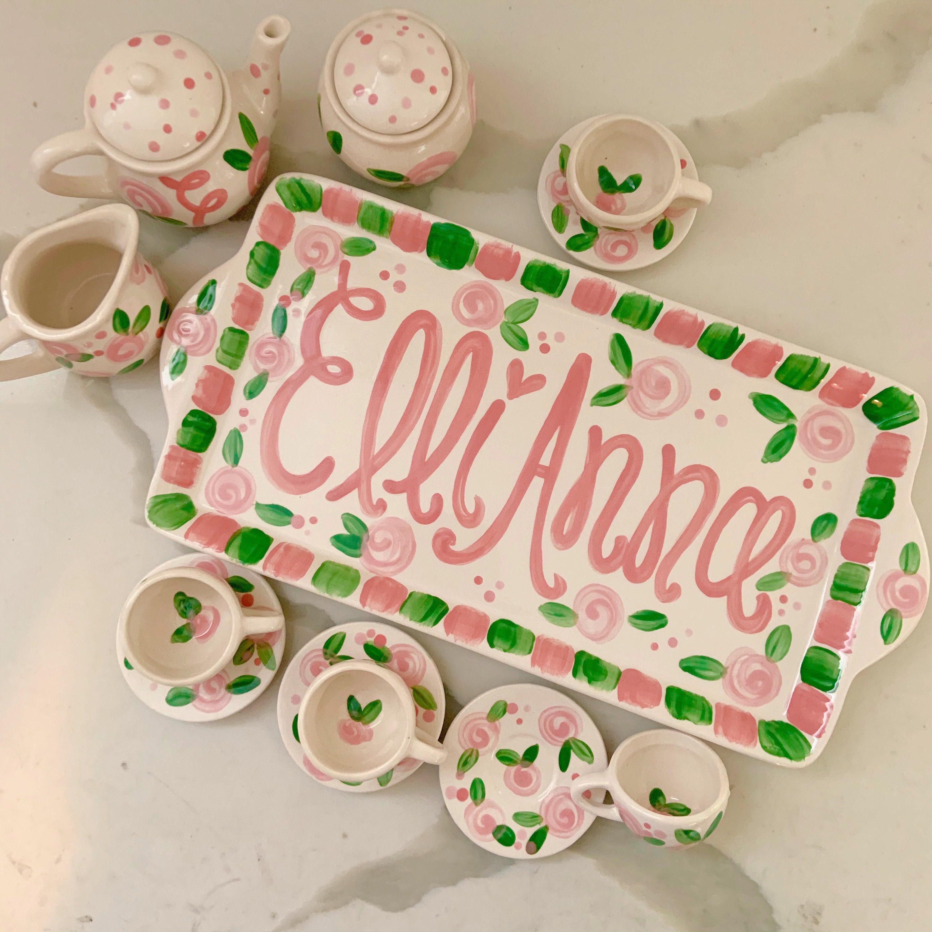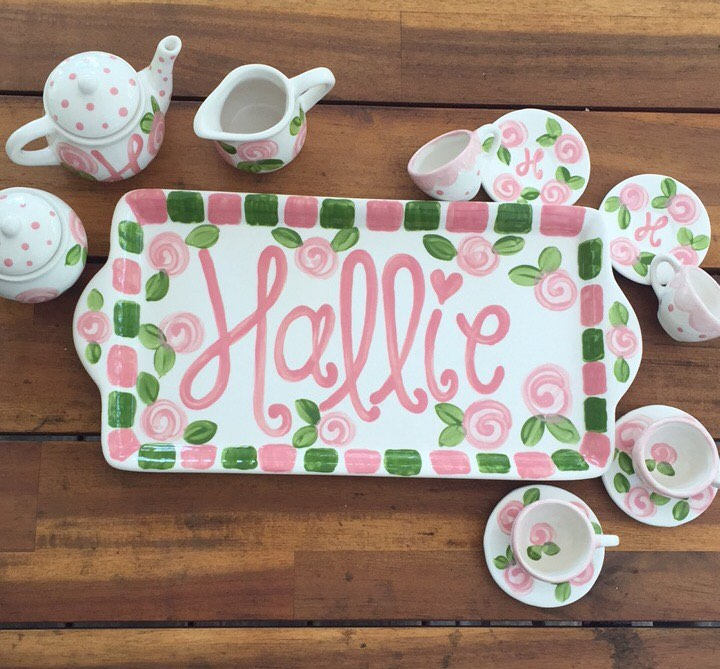 This tea set is handpainted in a precious pink rosebuds and polka dot design with your little one's name! Or I can add a fun phrase like "let's have some tea" or "tea time"