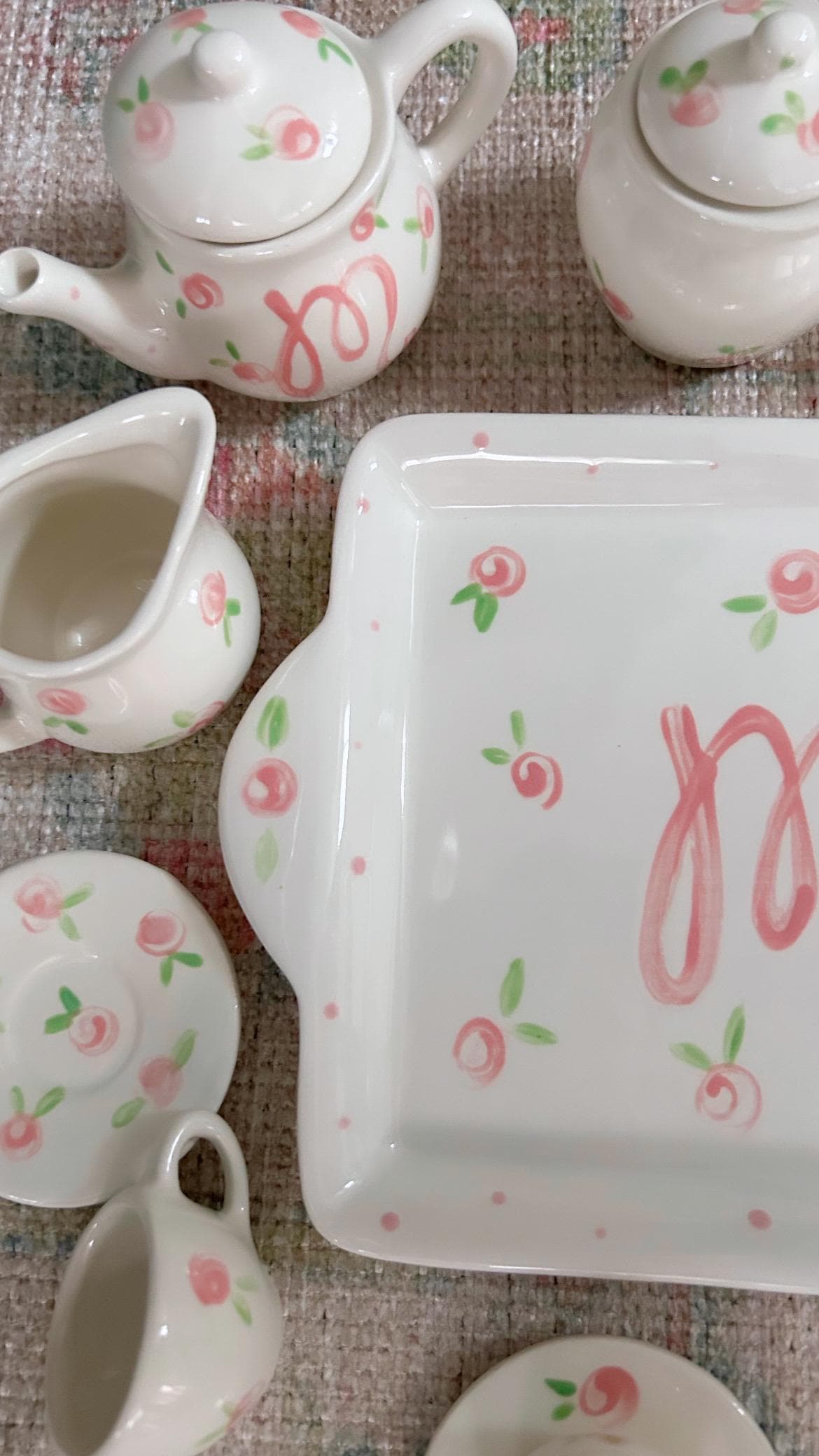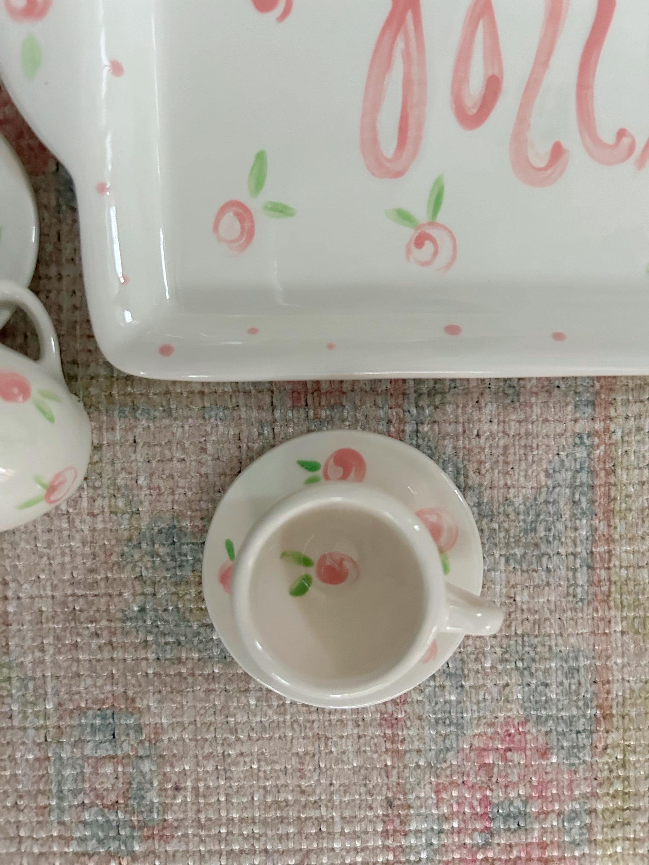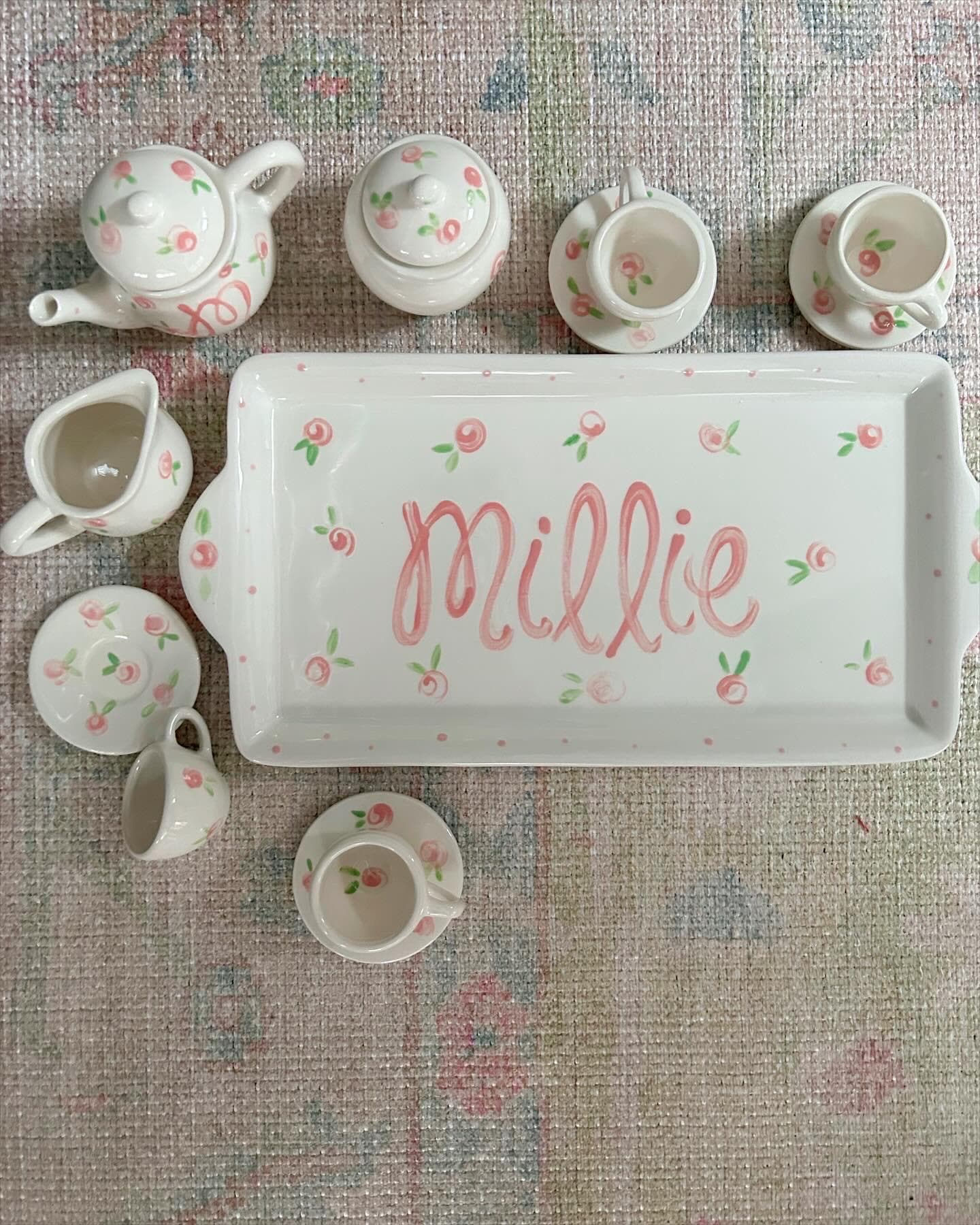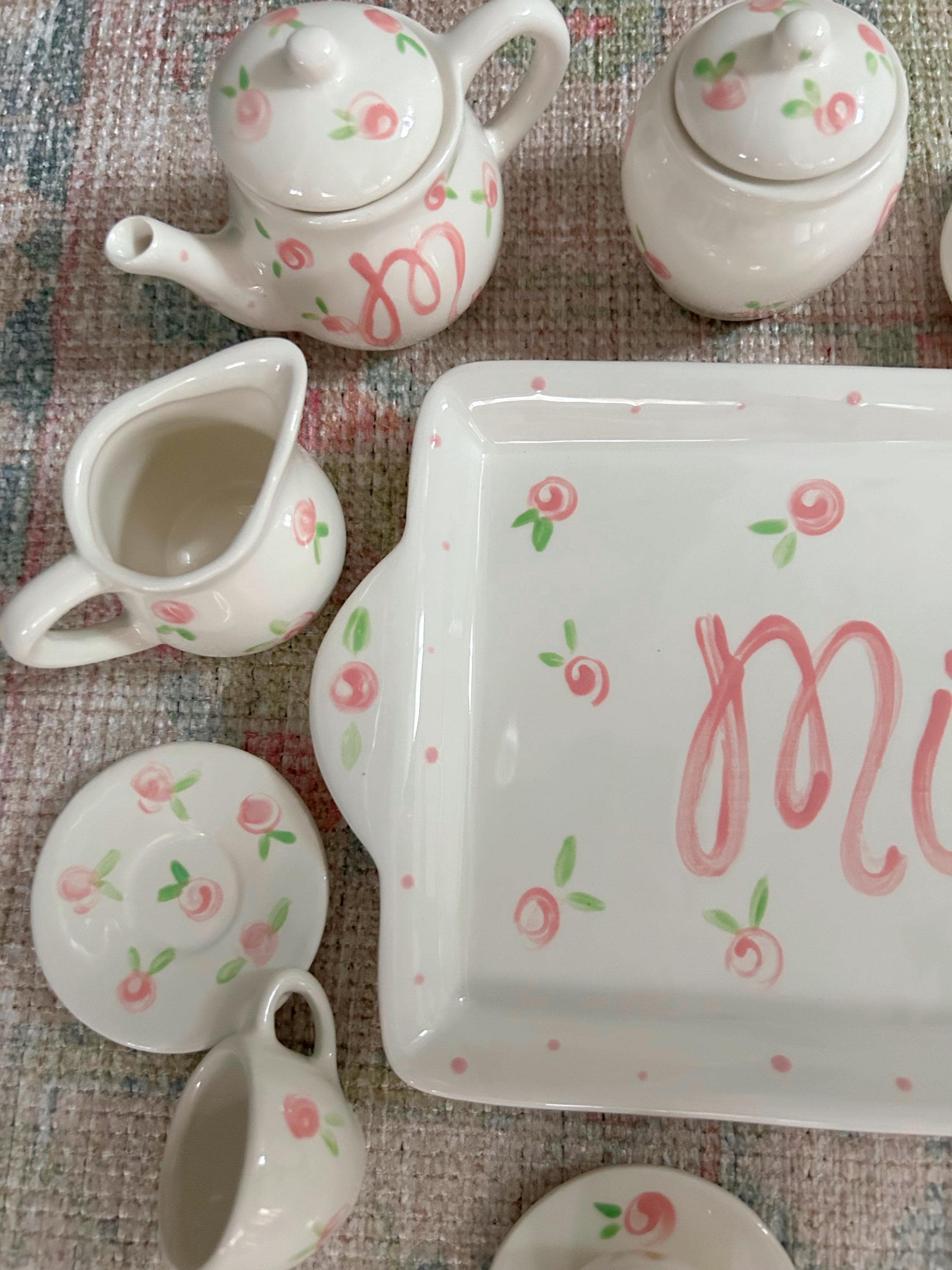 This tea set is handpainted in a precious pink rosebuds and polka dot design with your little one's name! Or I can add a fun phrase like "let's have some tea" or "tea time"